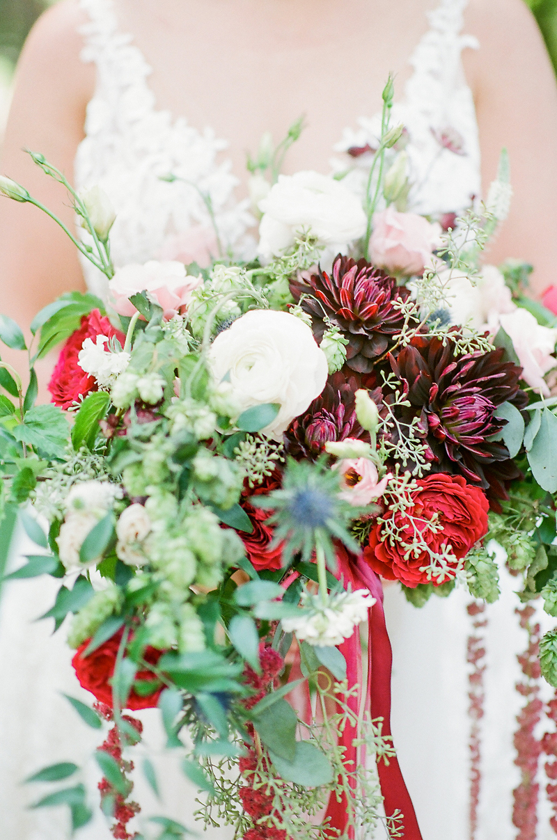 Signature Bridal Bouquet -- Plum Dahlia, White Ranaculaus, Blue Thistle