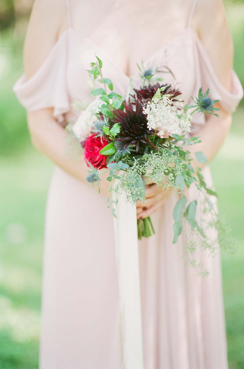 Bridesmaid Bouquet -- Red Rose, Queen Anne's lace, Blue Thistle