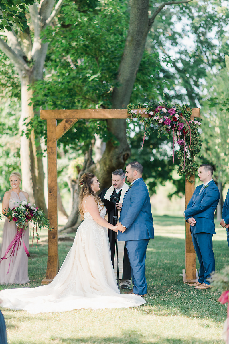 Ceremony wood arch floral arragement, with plums and jewel tones