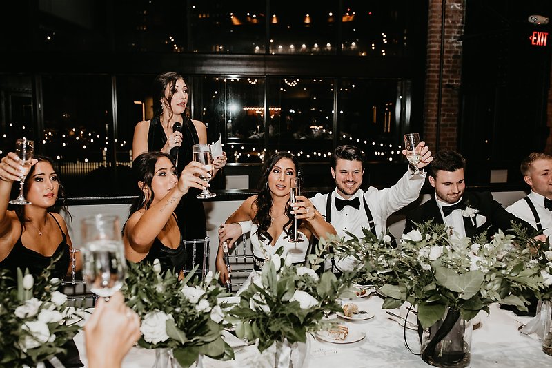 Cheers to the new Mr. and Mrs! Repurposing bridesmaid bouquest for table