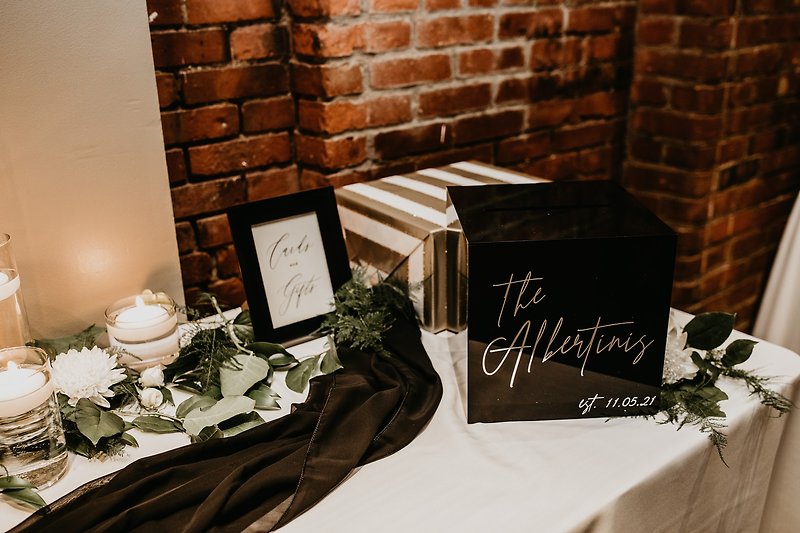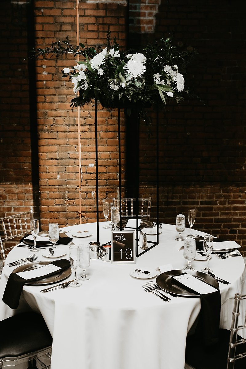 Tall table centerpiece on black wire frame boxes, by Dietz Floral Studio