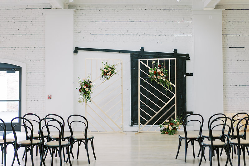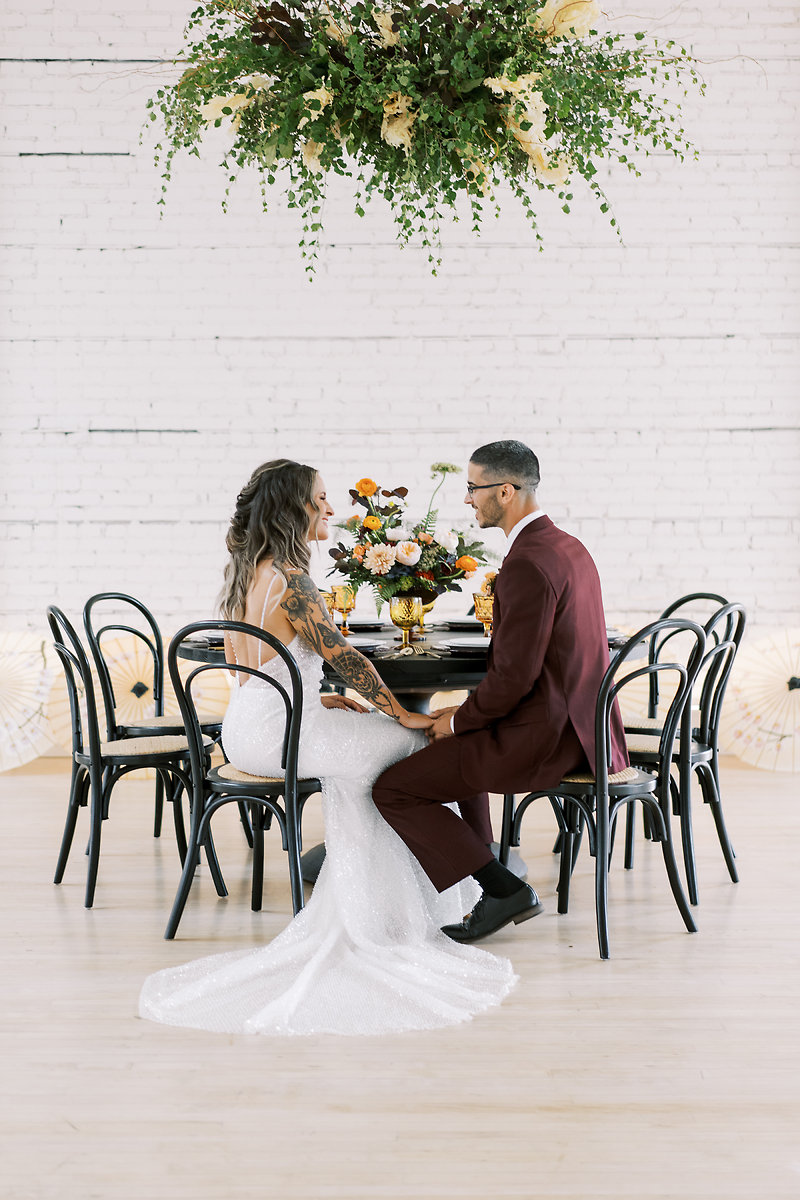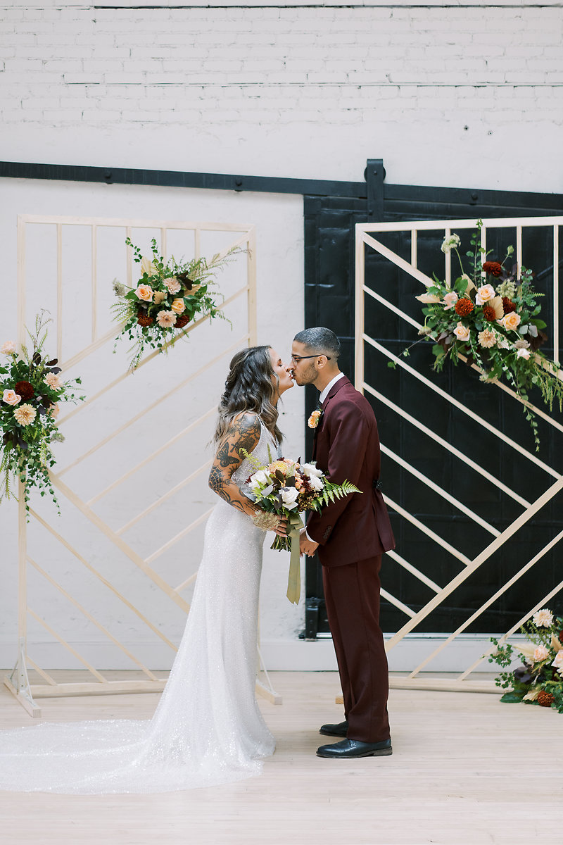 Ceremony view of the first kiss, of Mr. and Mrs -- hanging floral installation
