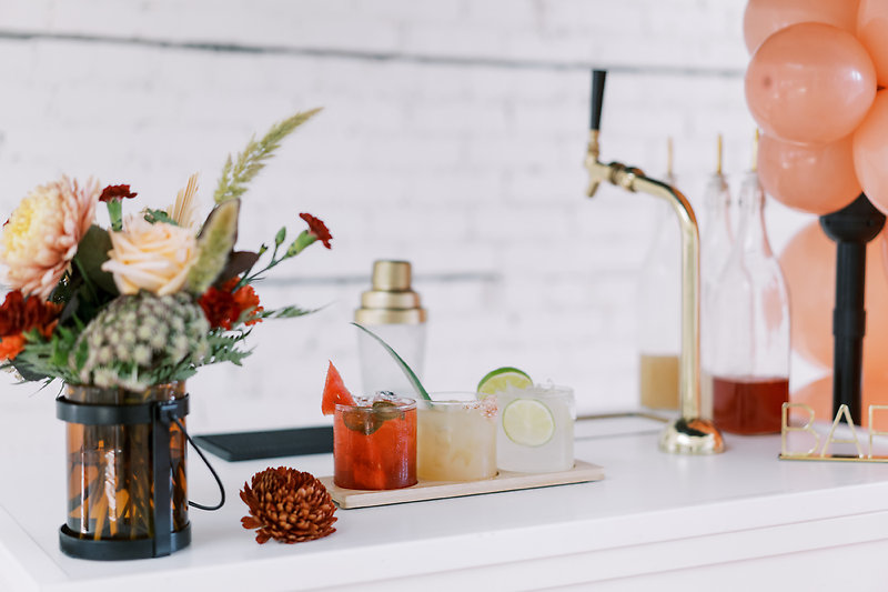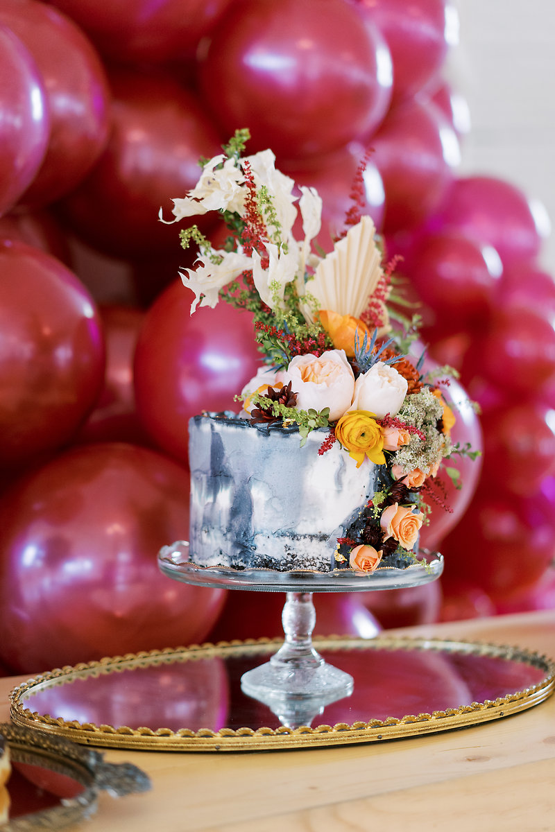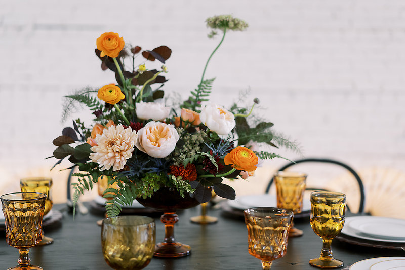 Reception table centerpiece with peach, orange and burgundy flowers.