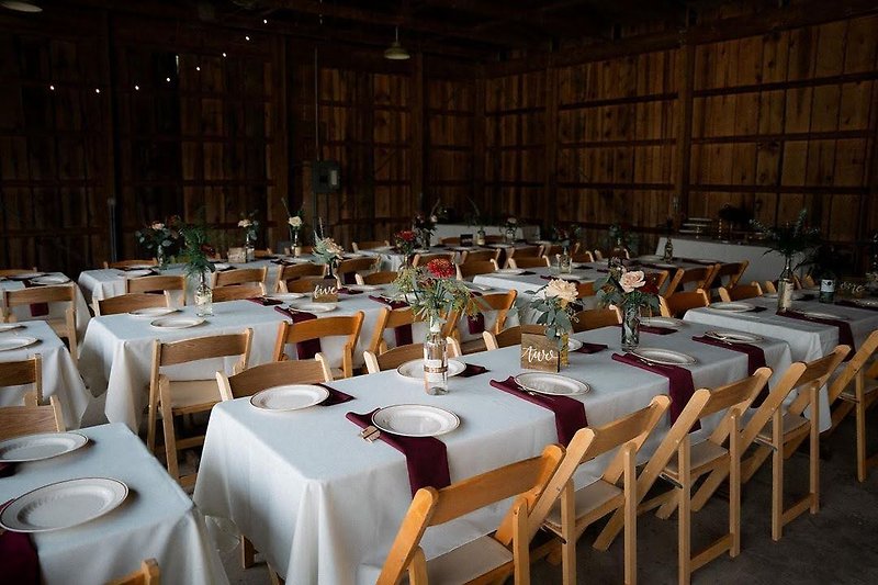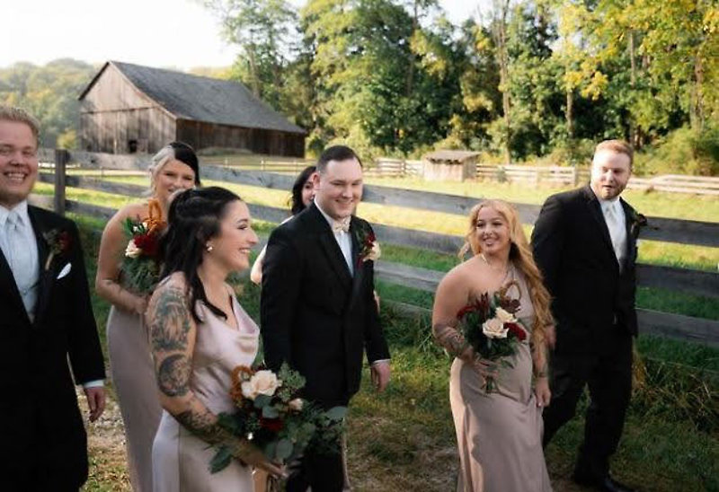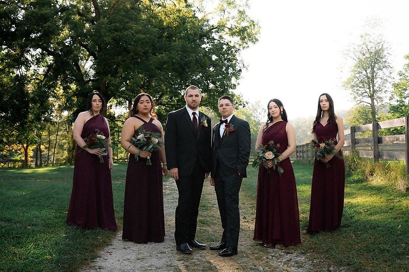 The Attendants are looking sharp next to the Grooms in merlot gowns and matching bouquets.