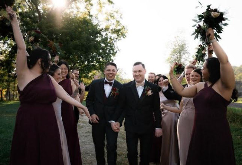 The Attendants are ready to celebrate with the Grooms in merlot gowns and matching bouquets.