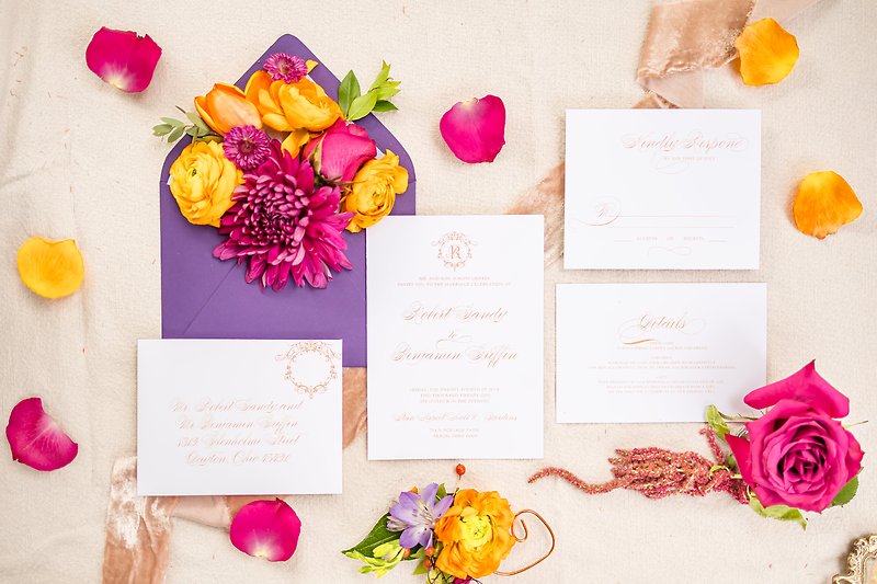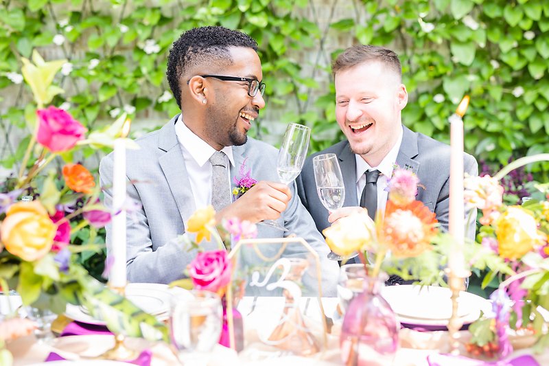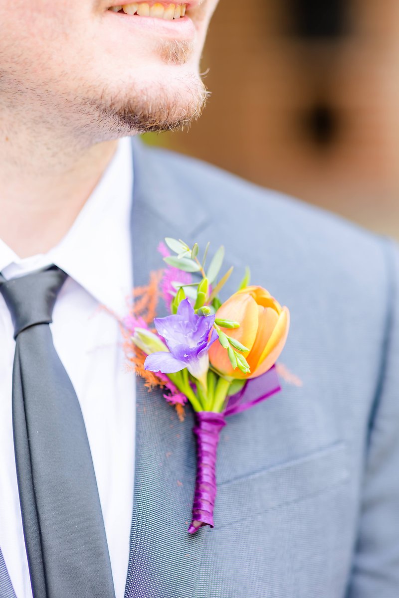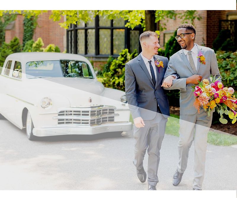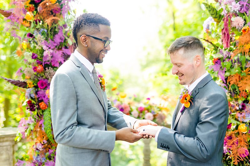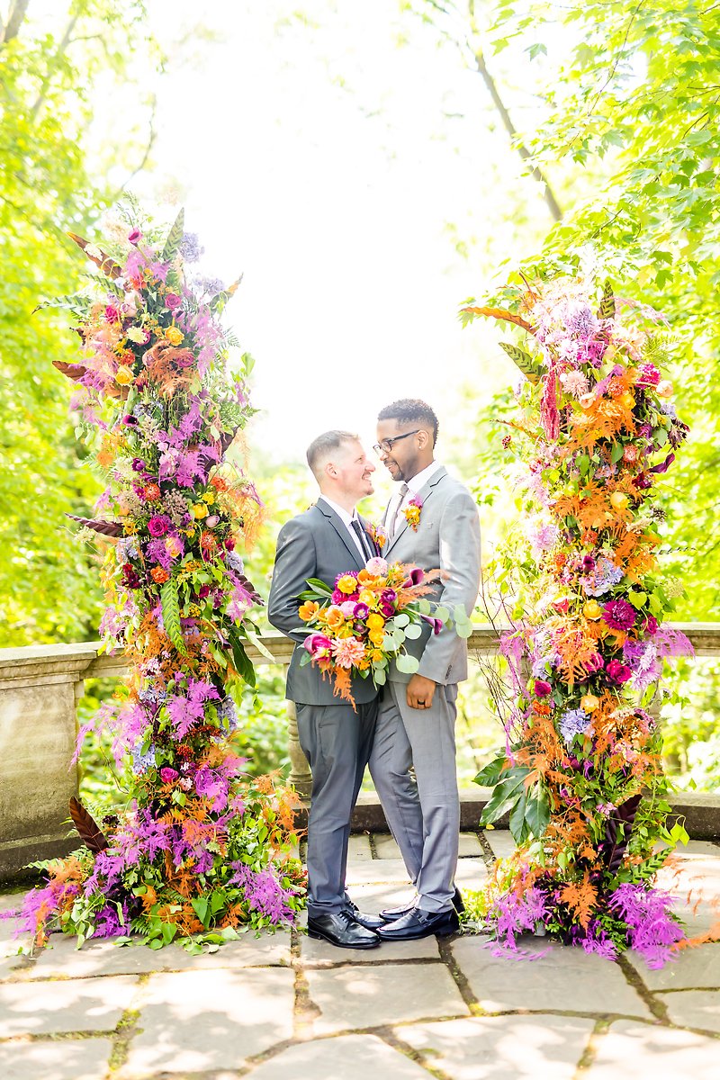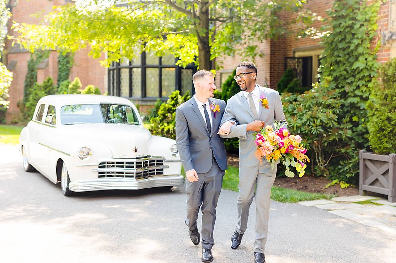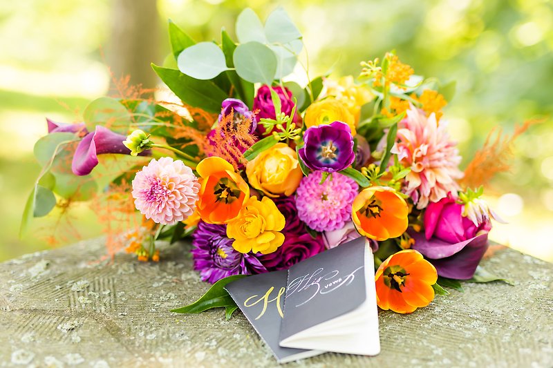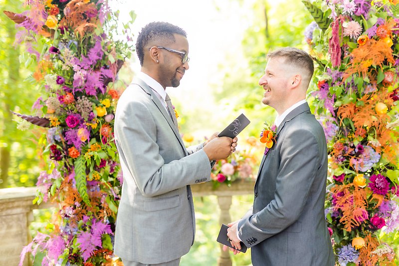 Hand stitched vow books for Mr. and Mr., bouquet wedding details