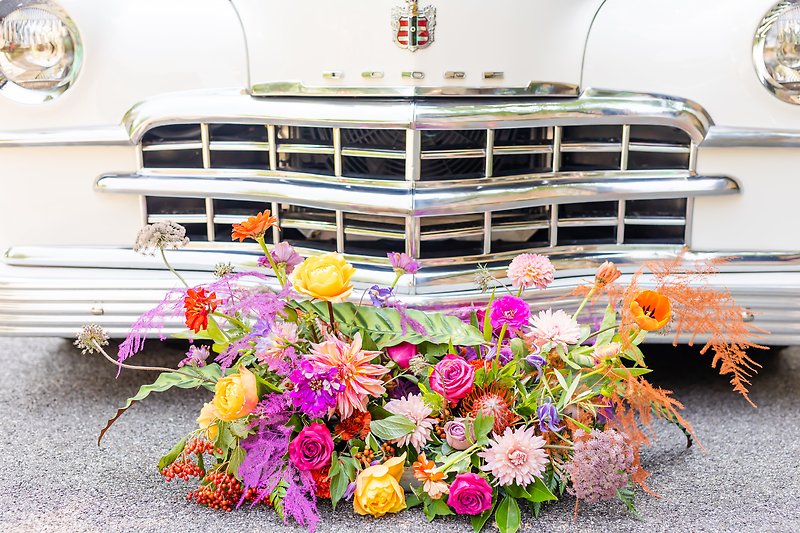Floral tower installation and wedding bouquet by Dietz Floral Studio